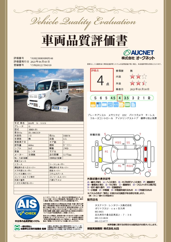 オリックスU-car北九州店の認定中古車は「全車」品質評価検査を受けています